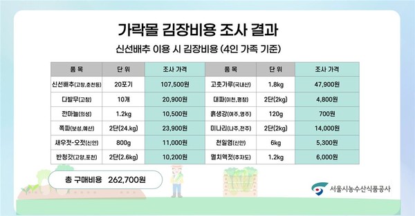 - 서울특별시농수산식품공사, 가락시장(가락몰) 김장재료 구매가격 조사 결과 발표