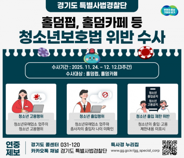 [서울시티 김청월 기자] 경기도는 11월 24일부터 12월 12일까지 3주간 도내 홀덤펍, 홀덤카페를 대상으로 청소년의 출입·고용 등 불법행위를 집중 수사한다.