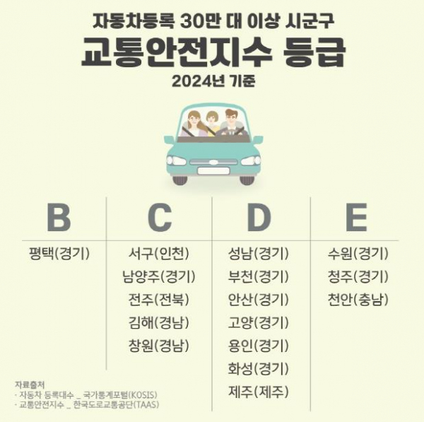 [서울시티 김청월 기자] 자동차등록 30만 대 이상 시군구 중 평택시의 교통안전지수 등급이 가장 높은 것으로 나타났다.