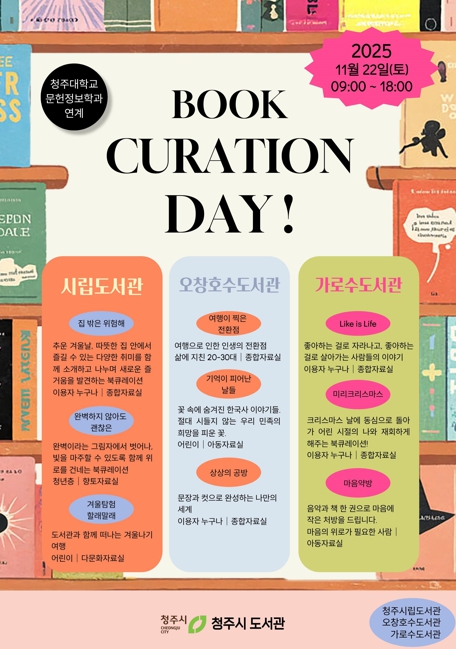 [서울시티 김청월 기자] 청주시립도서관은 청주대학교 문헌정보학과(지도교수 김혜영)와 함께 오는 22일 오전 9시부터 오후 6시까지 △시립도서관 △오창호수도서관 △가로수도서관 등 3개 도서관에서 ‘북큐레이션 데이’를 동시에 개최한다고 밝혔다.
