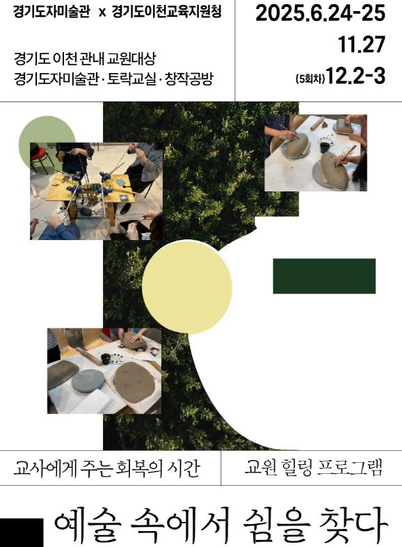 이번 프로그램은 ‘경기도이천교육지원청’과 협력해 추진되는 사업으로, 이천 관내 유․초․중‧고 교원을 대상으로 정서 회복과 심신 치유를 지원하고 교육현장에서의 재충전을 돕기 위해 마련됐다. 참가자들은 도자와 공예 중심의 예술 체험을 통해 심리적 휴식을 경험할 수 있다.