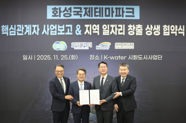 이날 김 지사는 정명근 화성시장, 임영록 신세계그룹 사장, 안정호 K-water 그린인프라부문장과 ‘화성 국제테마파크 지역 일자리 창출 및 상생협력 업무협약’을 체결했다.