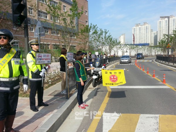 화성동부경찰서(서장 박명수)는 2015. 4. 28일(화) 08:30경 화성시 동탄 제2신도시 아인초등학교 앞에서 경비교통과 교통안전계장(경위 차길영)이하 교통외근 경찰관 6명, 모범운전자회20명, 녹색어머니회 20여명, 학교 교직원 10명 총 60여명이 어린이 교통사고 예방을 위해 피켓을 들고 아인초 초등학생들과 교통안전 캠페인을 실시하였다.