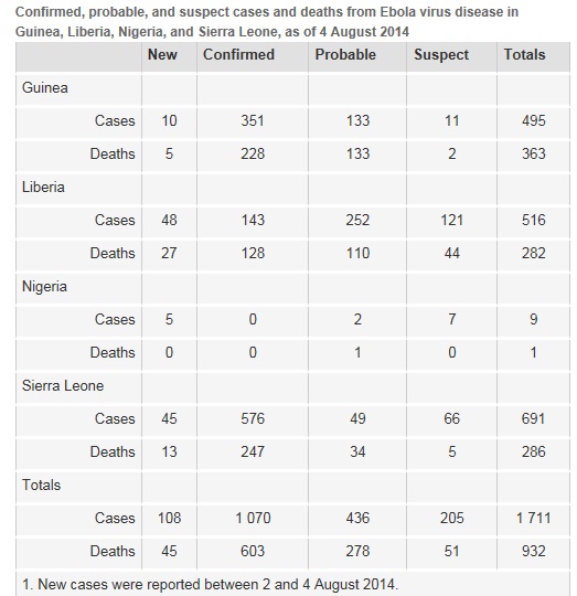 에볼라 바이러스로 인한 사망자가 급속히 늘어 9백명을 훌쩍 넘어섰다. 세계보건기구가 공식 집계한 에볼라 사망자는 지난 4일 기준 기니 363명,시에라리온 286명,라이베리아 282명,나이지리아 1명 순이다
