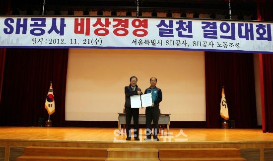 SH공사 이종수 사장(왼쪽)과 김재도 노조위원장이 21일 본사에서 전 임직원이 참석한 가운데 ‘SH공사 ‘SH공사 비상경영 실천 결의대회’를 가졌다.