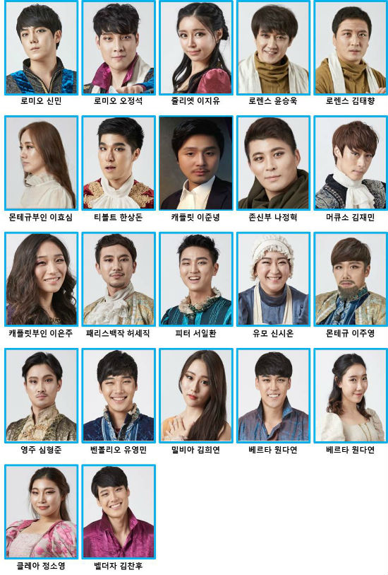 사랑에 목숨을 바치는 정열적인 남자 로미오에는 뮤지컬과 방송활동을 통해 꾸준히 얼굴을 알려온 ‘신 민’과 다양한 뮤지컬에서 많은 사랑을 받고 있는 오정석이 캐스팅 되었다. ‘신 민’은 ‘러브 인 뉴욕’에서 남자주인공 유태민 역을 맡으며 많은 관심을 받았으며 M.NET과 KBS 등 다양한 프로그램에서 활동했다. 이 두 남자의 사랑을 받는 줄리엣에는 ‘미스터온조’ ’더 초콜릿’ ‘사랑을 이루어드립니다’ 등에 출연하며 많은 사랑을 받았던 이지유가 캐스팅 되었다. ‘로미오와 줄리엣’의 사랑의 오작교 역할을 하는 로렌스 신부에는 뮤지컬 ‘엘리자벳’과 ‘모차르트’ ‘황태자 루돌프’등 에서 큰 박수를 받았던 윤승욱과 연극 ‘가을반딧불이’에서 사토시로 열연을 보였던 김태향이 맡는다.