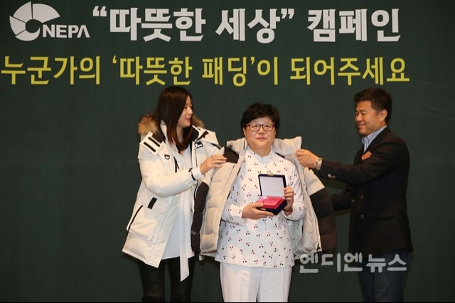 이어서 네파 박창근 대표이사는 젊은 시절 보육원 봉사를 통해 가정이 없는 아이들에게 따뜻한 집이 되어 주겠다고 다짐한 후, 두 명의 아이를 낳고 다섯 명의 아이를 입양해 키우고 있는 ‘아이들의 희망천사’ 김순임-최영두 부부에게 패딩과 감사패를 전했다.