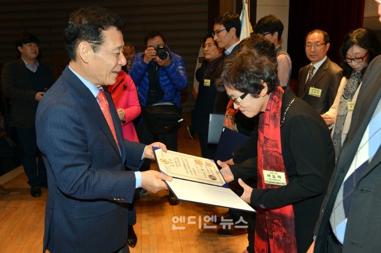 윤장현 광주광역시장은 8일 오후 시청 3층 대회의실에서 자원봉사자와 시민 등 800여 명이 참석한 가운데 열린 2015 자원봉사자대회에 참석해 자원봉사 유공자들에게 표창을 수여하고 기념촬영을 하고 있다.