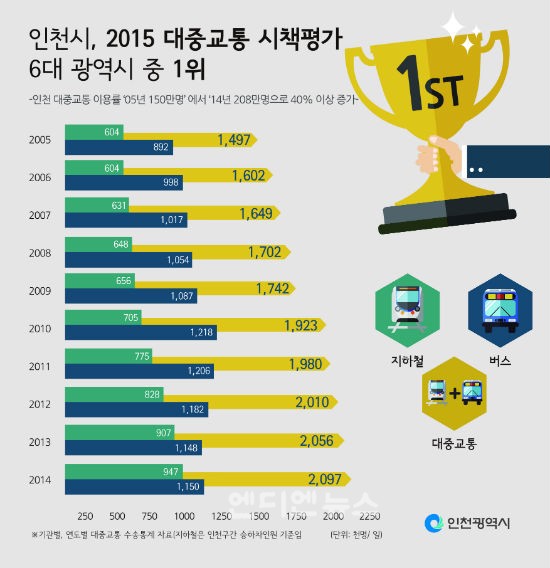 한편, 인천의 대중교통 이용 시민은 2005년 150만 명에서 2014년 210만 명으로 40.1%(60만명) 증가해 시가 일관되게 추진해 온 대중교통 중심의 정책이 가시적인 성과를 거두고 있는 것으로 평가받고 있다.