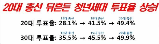 또한 이번 선거에서 2030세대의 투표율은 18대 총선에서 20대 28.1%, 30대 35.5%에 그치던 것에 비해 약 50%에 이르러 청년세대 투표율 급등은 사전투표제의 도입도 영향을 미쳤지만 ‘정치를 바라보는 청년들의 인식 변화’가 가장 큰 원인으로 분석됐다.