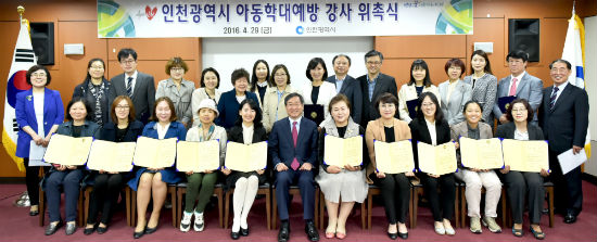 인천시는 4월 29일 시청 장미홀에서 9만 3천여명의 아동학대신고의무자와 부모 등을 대상으로 하는 아동학대예방교육의 효율성을 높이기 위해 아동학대예방교육 전문강사 31명을 위촉했다고 밝혔다.
