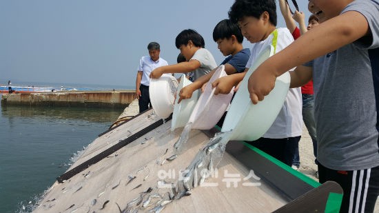 이날 학생들은 질병검사를 마친 9cm 내외의 우량 참조기 치어 5만미를 바다에 직접 방류하는 체험을 했다.